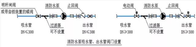 2、消防水泵的出水管,上應(yīng)設(shè)止回閥、明桿閘閥;當(dāng)采用蝶閥時(shí),應(yīng)帶有自鎖裝置;當(dāng)管徑大于DN300時(shí),宜設(shè)置電動(dòng)閥門(mén);